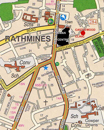 Coming from the Rathmines Rd, Castlewood Terrace is the first turning off Castlewood Avenue. This is where the car park is to the Swan Centre.